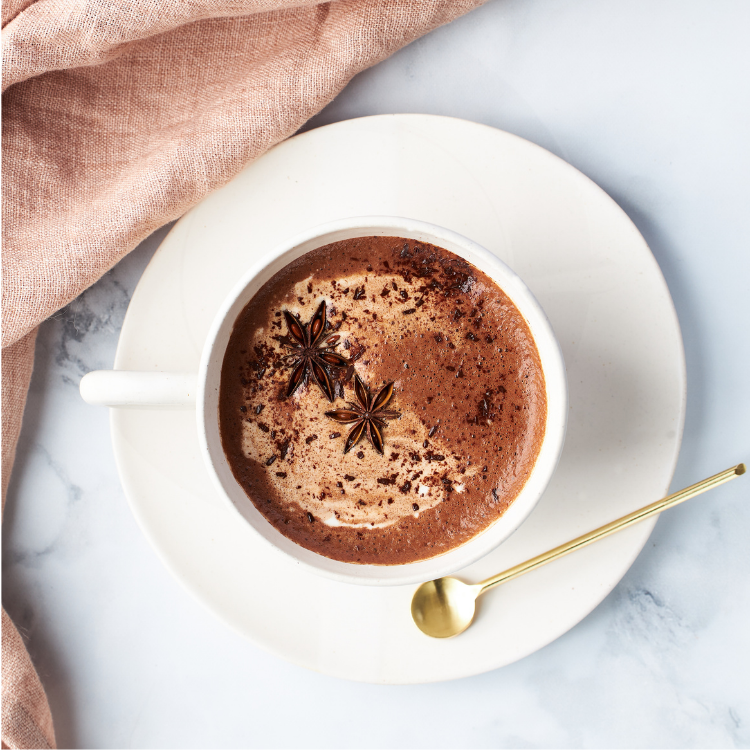 A hot cocoa made with our signature dark chocolate mix and served in Eric Bonnin ceramic mug.