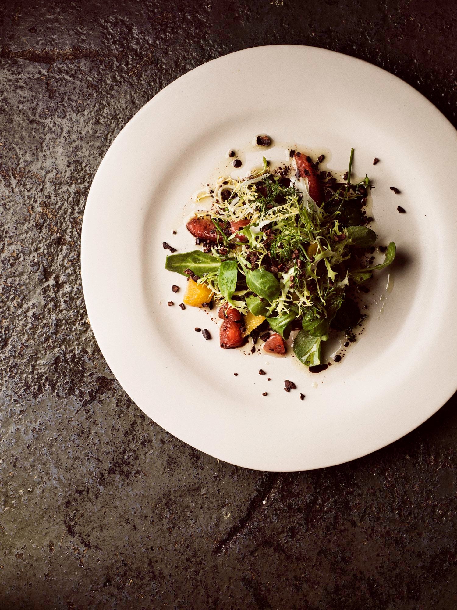 Cacao nibs sprinkled over a fresh salad.