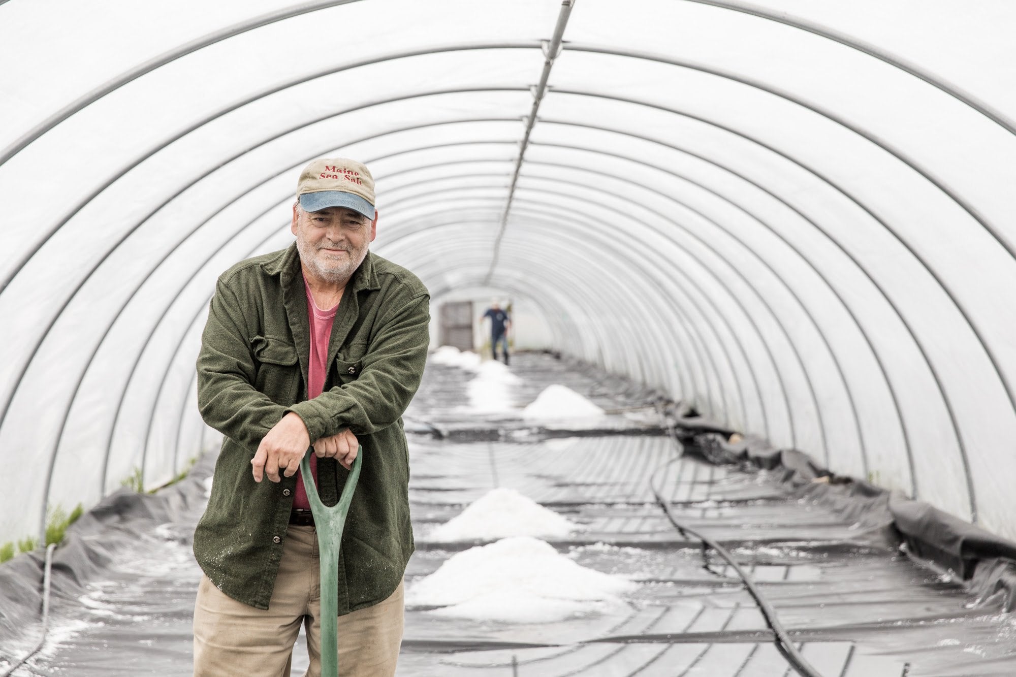 Steve: I read several books on salt, and of course, online you can learn an awful lot. It kind of evolved – we started out trying to heat the water for evaporation, and we did that for awhile using a propane burner, then we went to a wood-fired cook pan. That was cumbersome and it didn’t make a good product. We decided to try solar evaporation. I built these pup tents, which were a sheet of plywood with an A-frame attached to them. We put in a plaster liner, we covered it with plastic, and put water in the pool. That’s how we made our first batch of salt. From there, we just started building more and more. I ended up with about eighty tents. In 2006, we moved from the Brunswick area to Machias, Maine. At that point, we decided if the pup tent style worked, let’s do the same thing with larger greenhouses. So we built much larger greenhouses that were two hundred feet long, and today we have sixteen of those. And we’re building more, might I add!