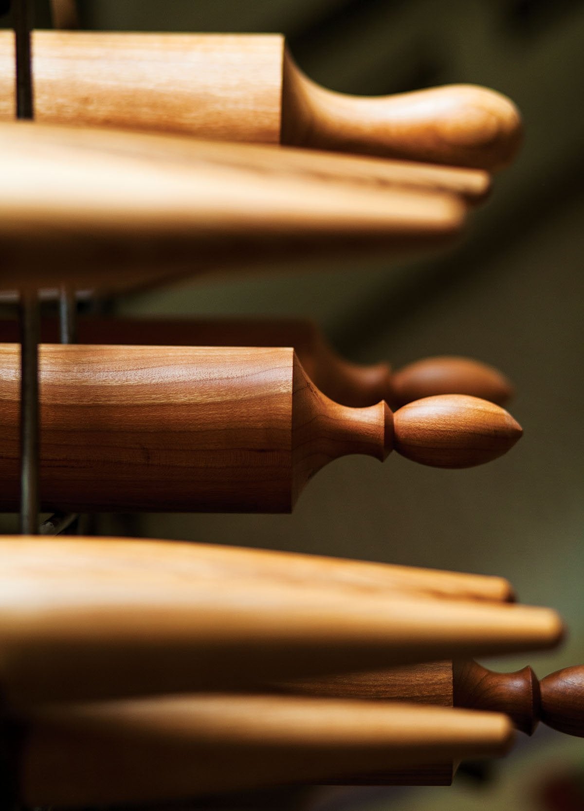 KF: Personally, I like the Flame, but that's just because it's a little more artisanal. It takes a lot more effort to get it right. They can break while you're turning them. The Shaker, the French, and our long pasta pins, which are 36 to 40 inches, are the three most popular. I hate to short the others—they all sell. But when push comes to shove, many traditional bakers want to stick with handles that they're used to. Or the French, which has no handles. And people love that. You're not restricted to handles in any way.